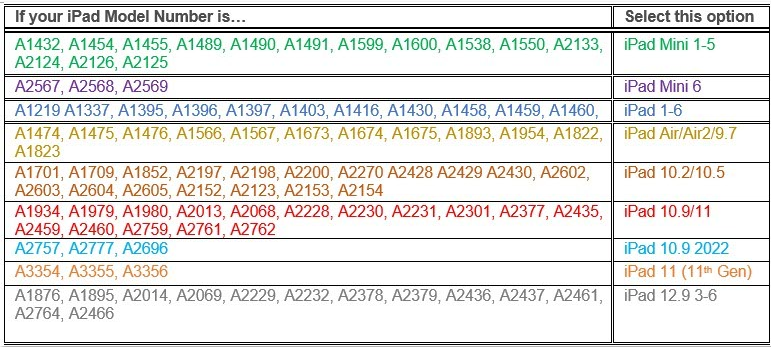 Then check your iPad model number to find the correct case. Our cases will only fit the models shown.
